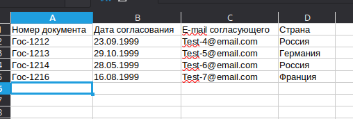 Создал excel-файл с полями Страна, Дата рождения, Имейл: