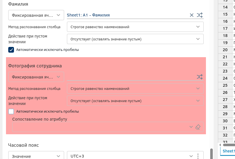 Открыл приложение в браузере инкогнито, проверил ещё раз маппинги, всё ок. После того как нажал "Загрузить объекты", подсветился красным раздел "Фотография сотрудника", и загрузка не пошла дальше: